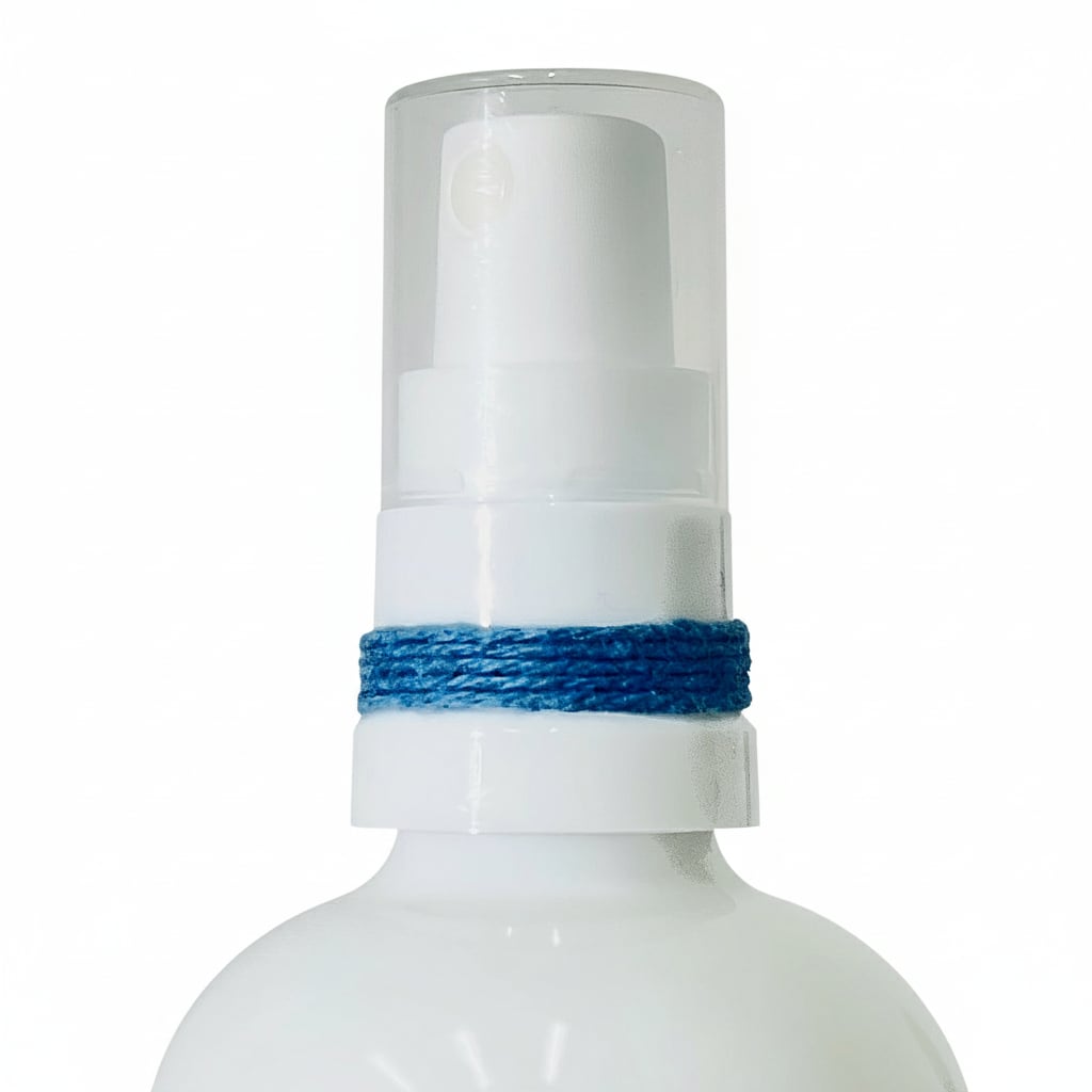 スプレー下部にはWatanabe'sによる、徳島の伝統を受け継ぐ藍染めの綿糸を幾重にもあしらいました。白一色のボトルに深い藍が静かに映え、自然とのつながりと、香りに込めた物語をそっと語ります。